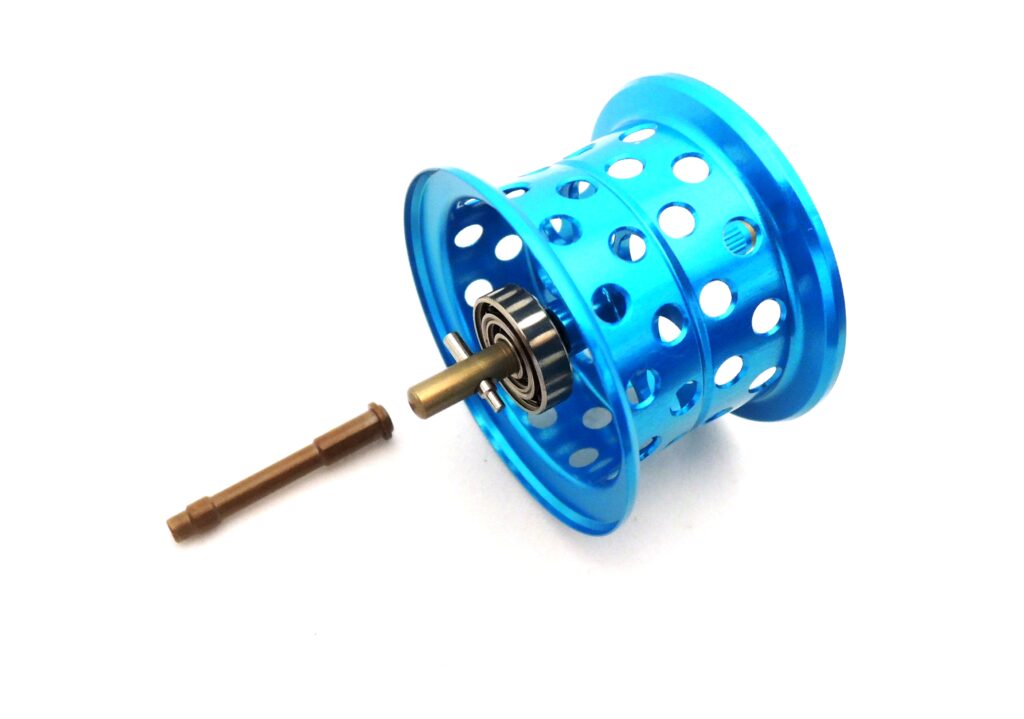 K.T.F.が担当したのはリールの要でもあるスプール部分。ベイトフィネスに対応しながらある程度の糸巻量を確保したシャロー(浅溝)タイプ(8lbs/50m)を採用し、軽快な使用感を実現しています。もちろんギヤボックス側・パーミングカップ側の両方とも『IXAダブルボールベアリング』を装備。チューニングモデルにふさわしい超高回転性能と耐久性能をもたらしています。