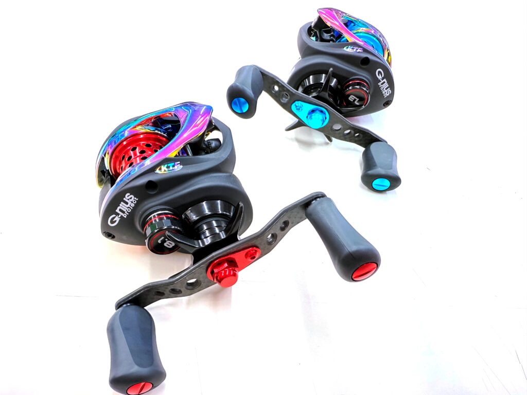 JBトップ50で活躍する青木哲プロのタックルブランド『G-nius Project(ジーニアスプロジェクト)』が発売するベイトリール『GRAVIUS』。さらにこれをベースに今江克隆プロの監修のもとK.T.F.がスプールデザイン・生産を行った台数限定モデルが『GRAVIUS K.IMAE AURORA K.T.F』です。