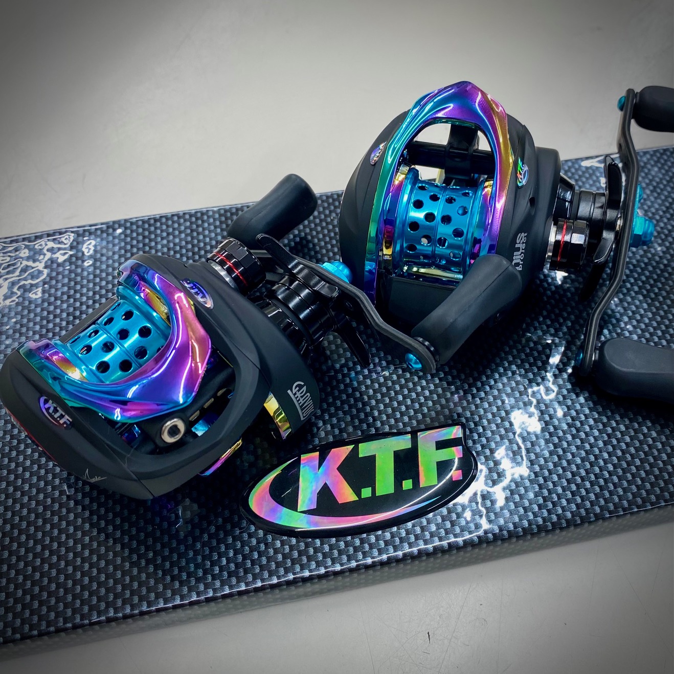 弊社ベイト&タックルキャリルで販売する台数限定の特別チューンも実施。メーカー出荷時点でのハンドルは「88mmメタル製+EVAノブ」となっていますが、これをスプール同色の「90mmIXAカーボンハンドル」に換装。ハンドル固定部も「IXA軽量ハンドルファスナ」を使用し、約10.5グラムの軽量化を実現。さらに弊社がチューニングを行った証、KTFステッカーを左右2か所に貼付してユーザーの皆様のお届けいたします。